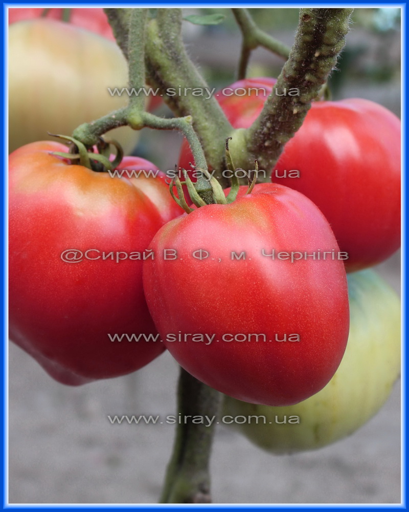 Кущ заввишки до 1.5м. Плід – рожевий, серцевидний, масою 200 – 400г. В середині плоду яскравий і насичений колір м’якості, яка дуже м’ясиста. Смакові якості високі. Чудовий баланс цукру і кислоти, цукор переважає. Високоврожайний.