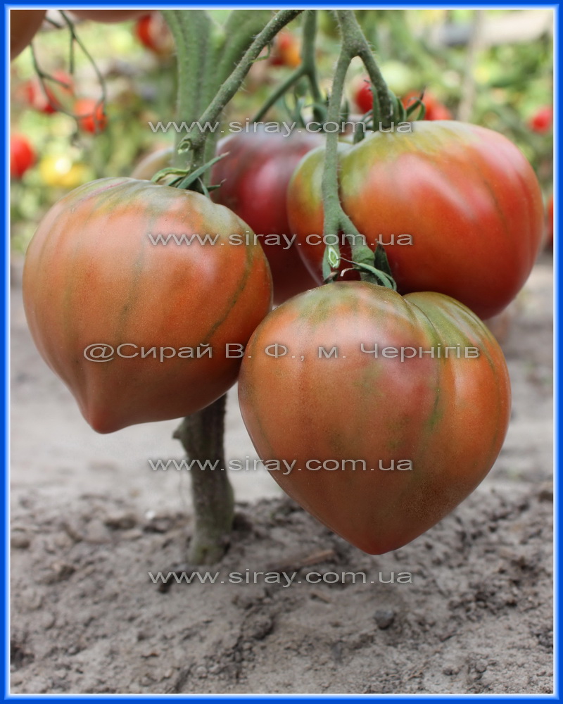 Кущ заввишки близько 1м. Плід – унікального пурпурово-бордового кольору із шоколадними плічками, масою 150 – 300г. Дуже красиві щільні серця. Дуже м’ясисті із насиченим томатним смаком. Насінневих камер мало, переважно одне щільне м’ясо. Є і солодощі і кислинка, але смак збалансований. Врожайність дуже висока.